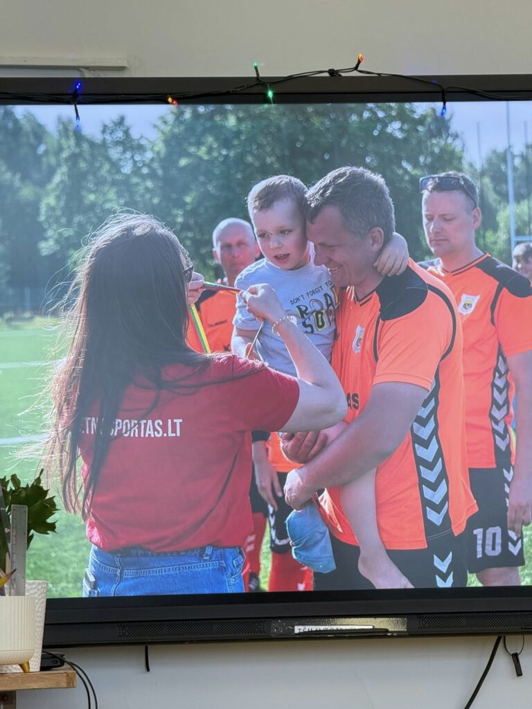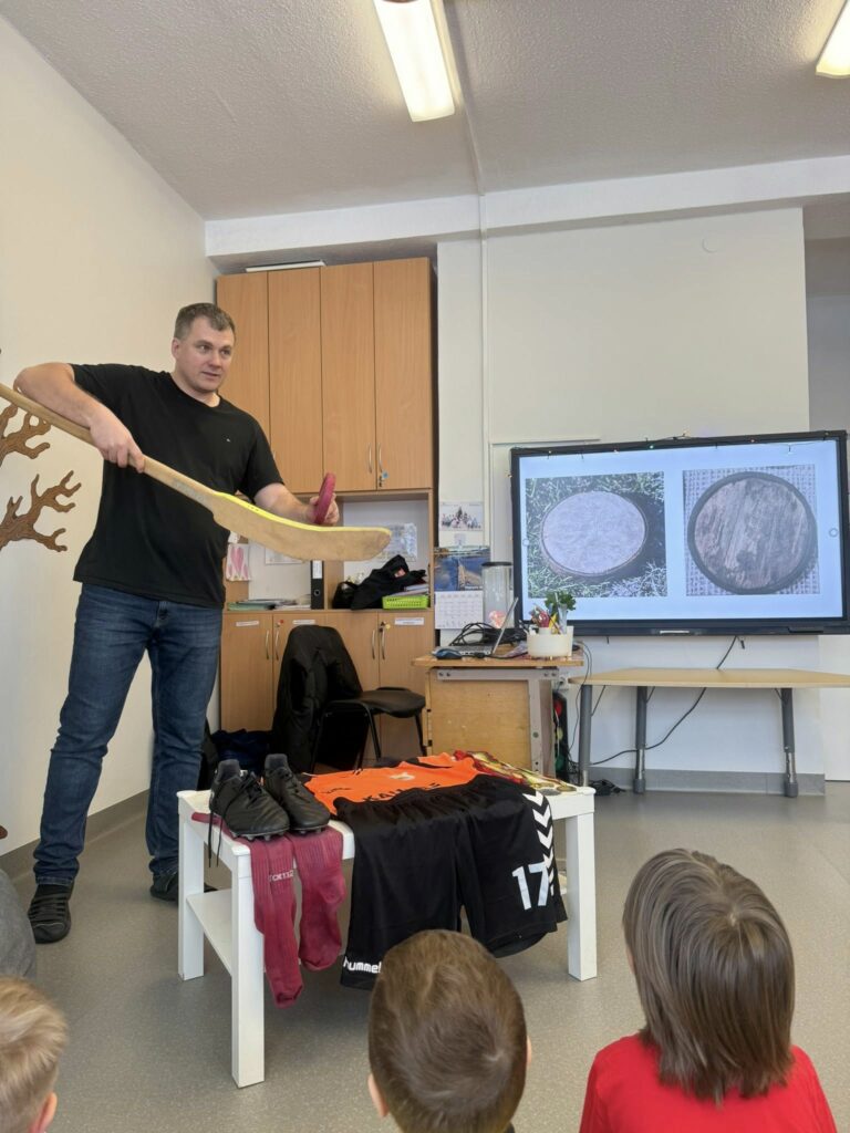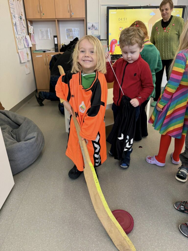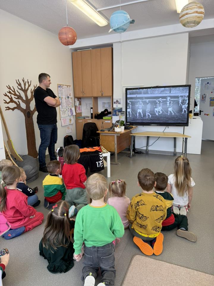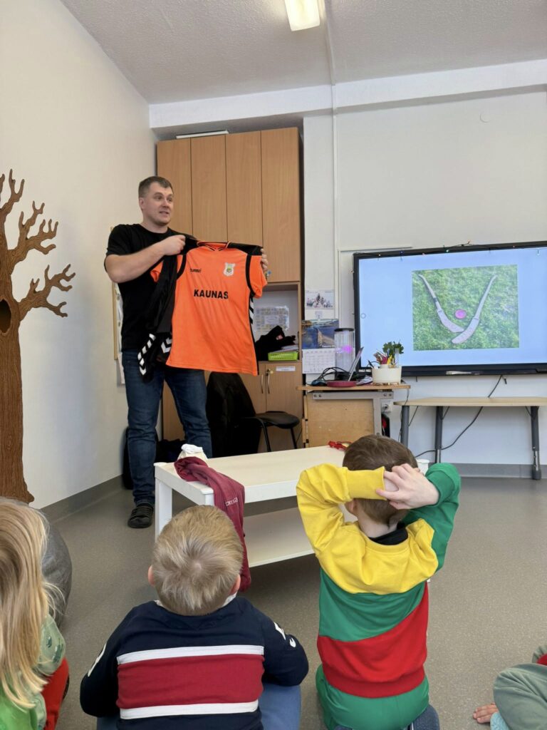 Tai žaidimas, kuriame naudojama medinė skritė, o komandos ją meta ar ridena į vartus ir stabdo lazdomis – ritmušomis. Žaidimą vaikams pristatė bendruomenės tėtis. Gyvas pasakojimas, parodytas inventorius ir galimybė patiems išbandyti sukūrė visai kitą patirtį nei skaitymas ar pasakojimas grupėje. Dėkojame už įsitraukimą ir kviečiame bendruomenę kurti ugdymą kartu.
